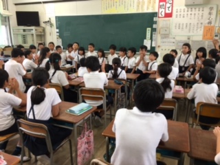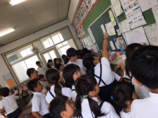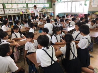 1年と5年で夏休みの作品などの鑑賞をしあいました。