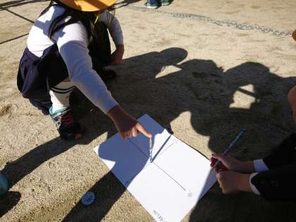 時間がたつと、かげの向きがどのようにかわるか観察、記録しています。
