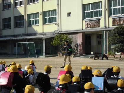 11月6日(月)の5時間目に、平野警察防犯係の2名のお巡りさんに来ていただき、不審者が校内に侵入したという想定で『防犯避難訓練』を行いました。お巡りさんから、次の5つの約束を守るようにというお話がありました。学校でも同様の指導をしていますが、ご家庭でもご確認をお願いいたします。