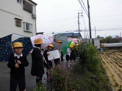 11月8日(水)、小雨の降る中、2年生は傘をさして校区内の町たんけんにいってきました。みんなが遊びに行く公園や商店街、交番や郵便局などをたんけんしてきました。