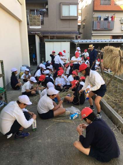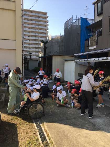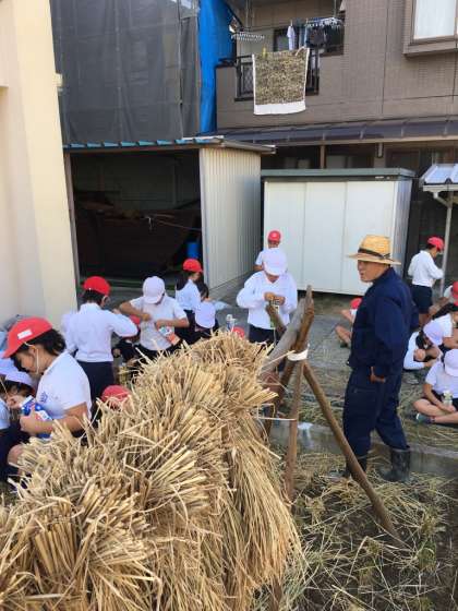 稲穂を牛乳パックの中に入れ、パックの口を閉じ稲穂を引き抜き籾(もみ)を貯めます。