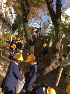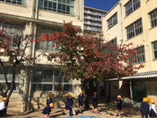 校庭の桜の木から落ちた赤や黄色の葉「きれい」「すてき」と拾いました。