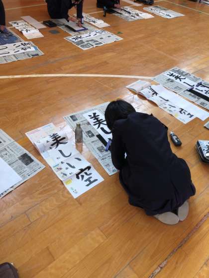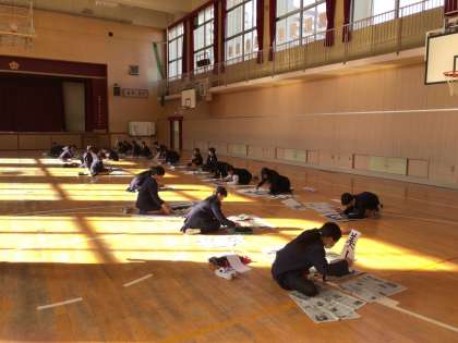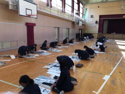 1月15日(月)の5時間目に、講堂で書き初めをしました。みんな真剣な表情で取り組んでいました。教室に掲示しますので、土曜授業のときにごらんください。