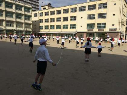 なわとび月間の取り組みで、15分休憩に1・3・5年生が音楽に合わせて縄とびをしました。前とび、駆け足とび、片足とび、後ろとび、綾とび、交差とび、二重とびなどにチャレンジしています。みんな曲に合わせ、一生懸命とんでいました。
