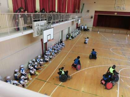ウィルチェアラグビーという車いすラグビーを見せて頂きました。車いすで、もの凄い勢いでぶつかり合ってプレーする選手を見て、子どもたちは大興奮でした。「かっこいい」「たのしかった」「やってみたいな」などの感想がたくさんありました。めったにない貴重な経験になりました。