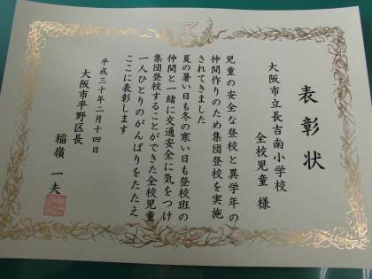 はじめに平野警察交通課のおまわりさんから「登校時の安全について」のお話をして頂いた後、稲嶺平野区長から「集団登校をよく頑張っている」ということで全校児童、「ひらちゃん読書ノートで目標冊数・ページ数を達成した」児童に対して、表彰していただきました。