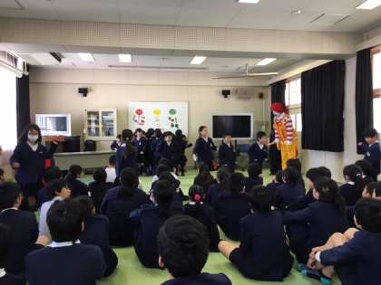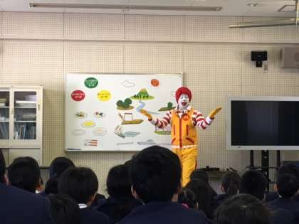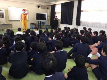 今日はマクドナルドの出前授業がありました。1年間ともに過ごしたペア学年同士仲良く座り、ドナルドが登場した時には大歓声があがりました。食育について学び、バランスよく食べること、好き嫌いは少しずつ減らすことなど教えていただきました。質問コーナーもあり、子どもたちも大満足なようでしたので、またご家庭でも話を聞いてみたください。