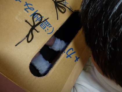 中が黒い箱の中で、けい光クリームで白くなった自分の手を、ブラックライトにあてて見ました。よごれている手におどろいていました。