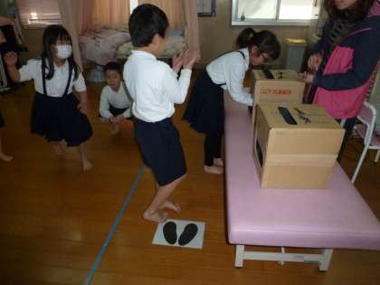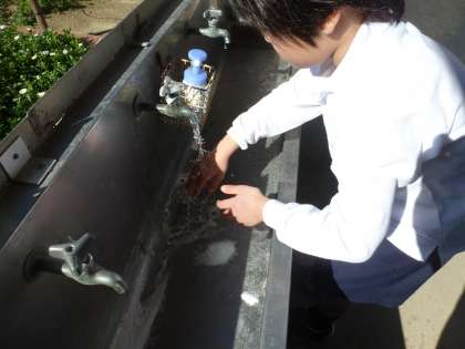 せっけんで洗ってもなかなかきれいになりません。そこで、きれいに洗う手洗いのビデオを見て手洗いの学習をしました。