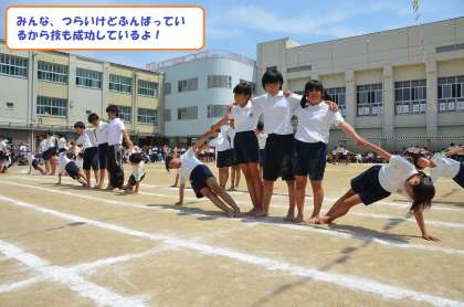 ○運動会の練習が始まった日から、ぼくは不安でした。なぜかというと、5年の運動会の 時に、ブリッジで失敗してはずかしく、くやしい気持ちが心の中でいっぱい、いっぱい だったからです。
