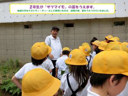 2年生が、はぐくみ農園せ「サツマイモ」の苗をうえました。きれいに耕された畦のところに、ていねいに植えました。