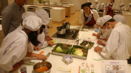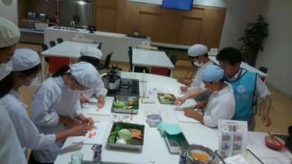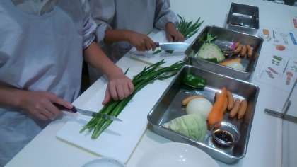 いよいよ調理開始です。真剣な顔で包丁を使っています。