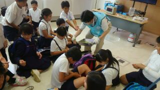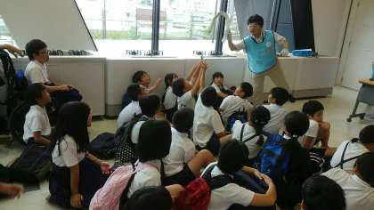 午後は冷熱実験を見学します。天然ガスを運びやすくするために冷やして液体にします。それと同じ性質の液体窒素を使った実験です。マイナス196度の液体にハンカチや風船をつけて、どうなるか実験しました。