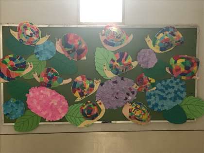 階段掲示が「かたつむりとあじさい」にかわりました。かたつむりは、いろいろな色をパスで塗りこみ、おしゃれなかたつむりになりました。あじさいは、小さい折り紙でたくさんの花を折り、みんなで集めて貼りました。学校に来られた時は、ぜひご覧ください。