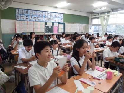 手鏡で自分の口の中を見て歯茎の形や色について観察し、歯周病になりかけている部分を探しました。歯垢染色で磨き残しに気づいたり、お菓子の食べ方や好き嫌いなど生活習慣についてもふり返りました。