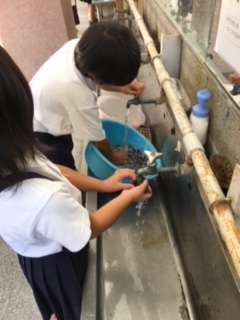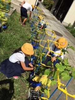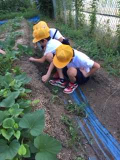 ザリガニの世話当番を決め、掃除やえさやり観察を意欲的にしています。「脱皮した」とみんなで感動し、「先生脱皮したのがなくなってる。」「食べたんや。」「脱皮したら黒く大きくなったと好奇心いっぱいです。はぐくみ農園のさつまいもも「育ってる。」「葉がいっぱいや。」など言いながら、おいしいサツマイモができるようにと草取りに精を出しています。一人一鉢の野菜も「トマトが赤くなった。」「持ってかえっていい?」「おいしかったよ」と毎日水やりをしたり観察をしたりしています。野菜は夏休みも育てて収穫を楽しんでほしいと思っています。