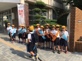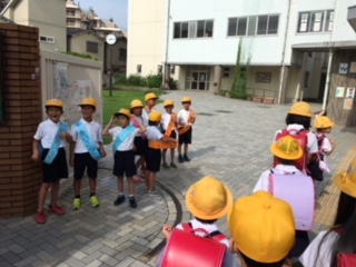 朝学校に来て、あいさつ隊のタスキをつけ元気に