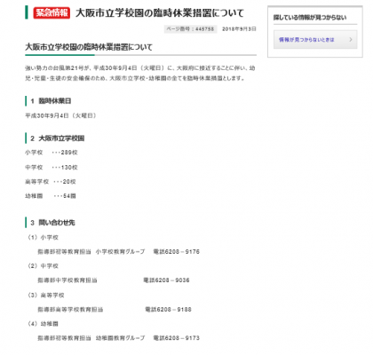 『強い勢力の台風第21号が、平成30年9月4日(火)に、大阪府に接近することに伴い、幼児・児童・生徒の安全確保のため、大阪市立学校・幼稚園の全てを臨時休業措置とします』という大阪市の方針に従って、本校も明日の平成30年9月4日(火)は臨時休業といたします。