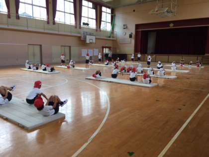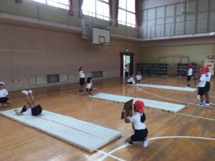 いろいろな運動をした後、前転や後転の学習をしています。