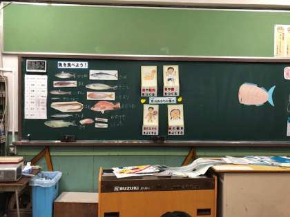 栄養指導の先生から、「魚」について学びました。クイズを通して、旬の魚のことやどんな栄養があるかについて知りました。