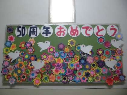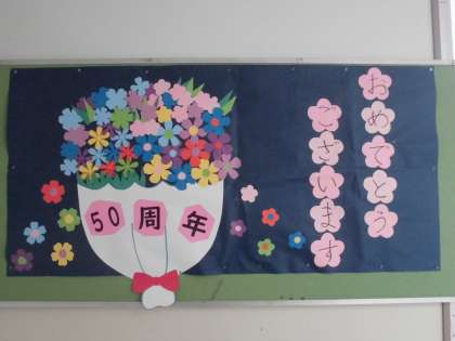 子どもたちは、毎日のように音楽発表会の練習や式典の練習に取り組んでいますが、このような素敵な掲示物で母校である長吉南小学校の50歳お祝いしてくれています。