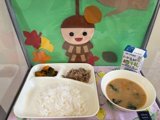 かぼちゃのいとこ煮にはだしの風味がしっかりあり、出汁の味と小豆・かぼちゃの優しい甘さとの調和がおいしさを引き出していました。(校長より)