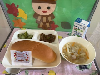 「牛肉のデミグラスソース煮」は、やわらかく煮込んだ牛肉を、コクのあるデミグラスソースでじっくり煮込みました。パンの献立によくあう一品です。