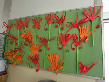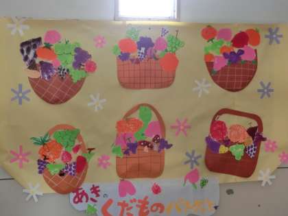 廊下や階段の掲示板には、秋の訪れや季節を感じさせる作品が見られます。まだまだ暑いですが…季節の味わいがありますね。