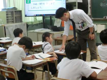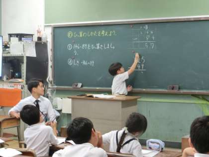 繰り下がりのある2けたのひっ算を学んでいました。各自が考えて答えを導き出した後、考え方を発表しました。今日の発表方法は、いつもよりグレードアップして、黒板に書き加えながら、説明することにチャレンジしていました。