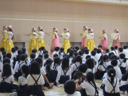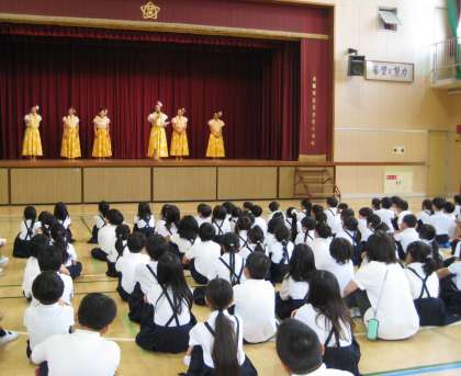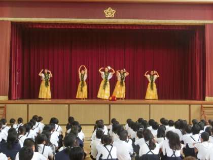 子ども達に、いろいろな国の文化を知り、日本との違いや良さを知ってもらいたいと常に願い考えています。今回は、フラの「角野祐美子 先生」とダンサーの方々、計10名のご厚意により、低学年・高学年に分かれて観賞会を行いました。