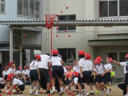 玉入れの曲に合わせて玉を投げ、曲が変わったら、ダンシング!