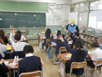 今日の給食は子どもたちに人気のポークカレーライスです。たくさんの子どもたちがおかわりをしていました。