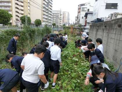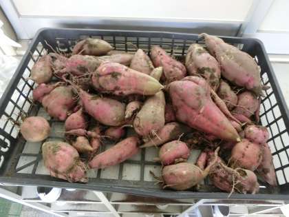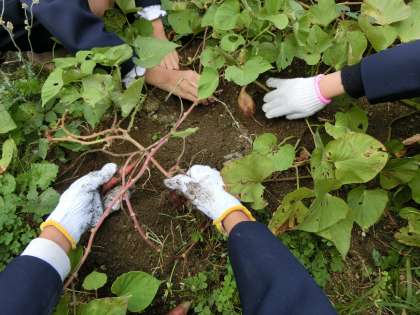 2年生がお芋掘りをしました。子どもたちは、土の中にある芋を見つけようと一生懸命に探していました。いろいろな大きさの芋が見つかり、収穫した芋はみんなで食べる予定になっています。