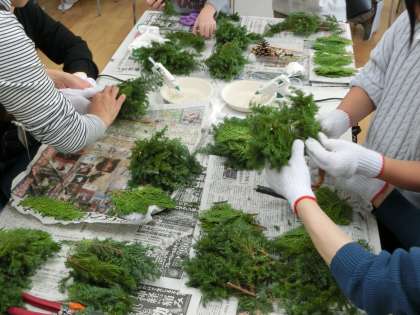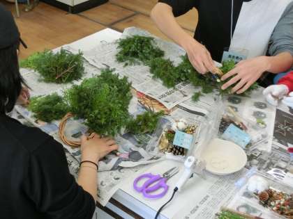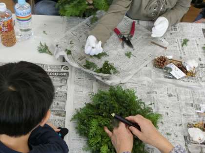 リースの基礎作りです。円形の土台に生の針葉樹やシダ系の枝を針金で巻いていきます。向きや重ね具合、針金の固定には少しコツが必要です。はじめは難しそうでしたが、慣れるとどんどんはかどっていました。この作業は子ども達より、大人の方の出番でした。