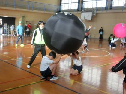長原小学校・長吉東小学校・長吉南小学校の4年生以上の子どもたちが集まり、スポーツ大会を行いました。例年、キックベースボールを行っていましたが、今年は「キンボール」というスポーツを行いました。
