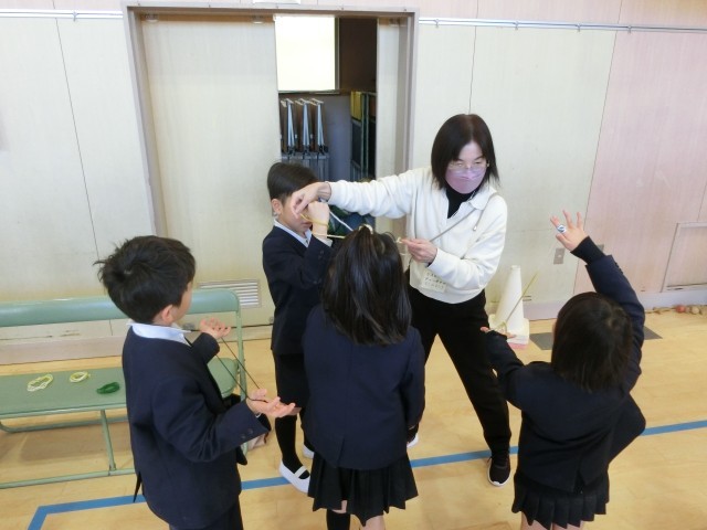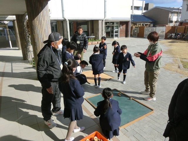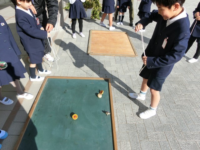 ひもをこまに巻き付けるところが、子ども達には最も難しいところです。巻き方や巻き方の方向。投げ方をていねいに教えてもらって何度もチャレンジしていました。
