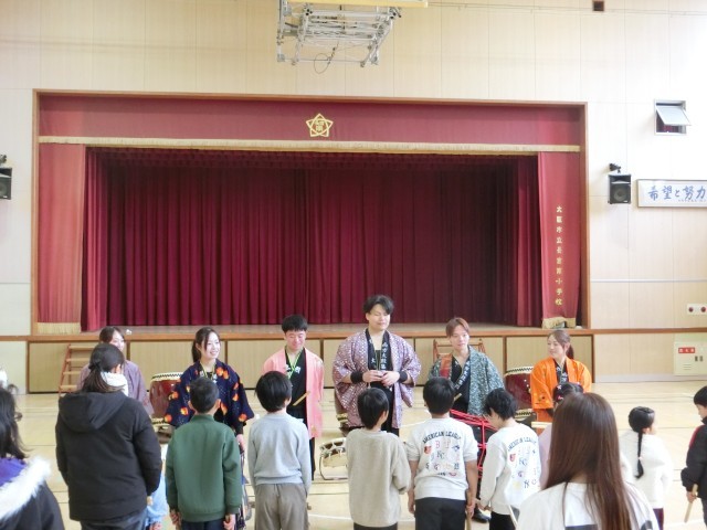 本日は、太鼓集団「烈火」の方々に来ていただきました。和太鼓の基礎知識から始まり、いろいろなリズムで和太鼓を叩きました。
