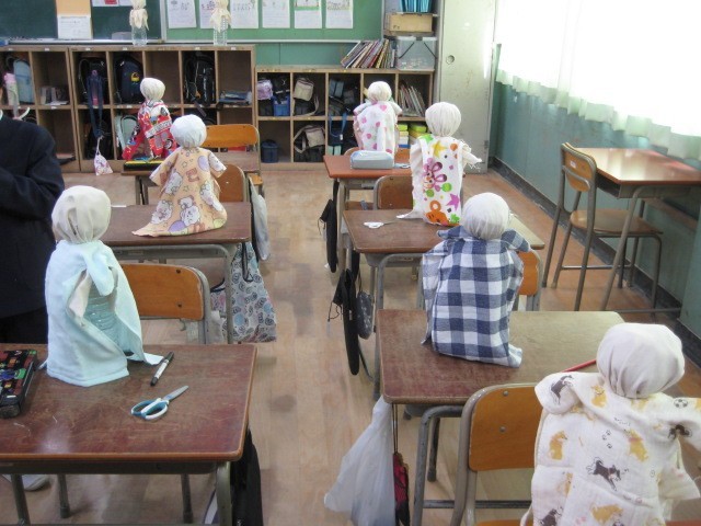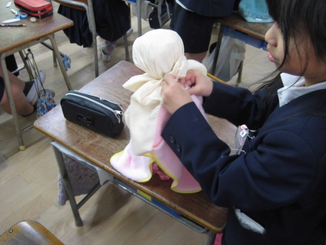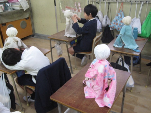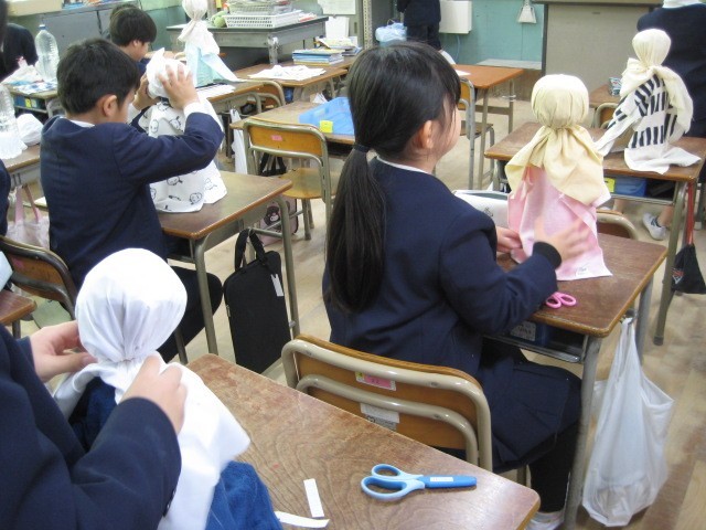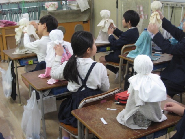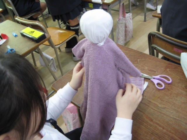 生活科では、家族のことを考えることも学習の一つです。実物に近い2㎏の赤ちゃん人形を自分の手で心を込めて作り、抱いたり語りかけたりなどの活動を通して、家族の気持ちを考え感謝の心にもつなげます。難しい部分もありますが、手先を器用に動かしてうまくできると満足して喜ぶ姿が見られました。できあがりが楽しみです。