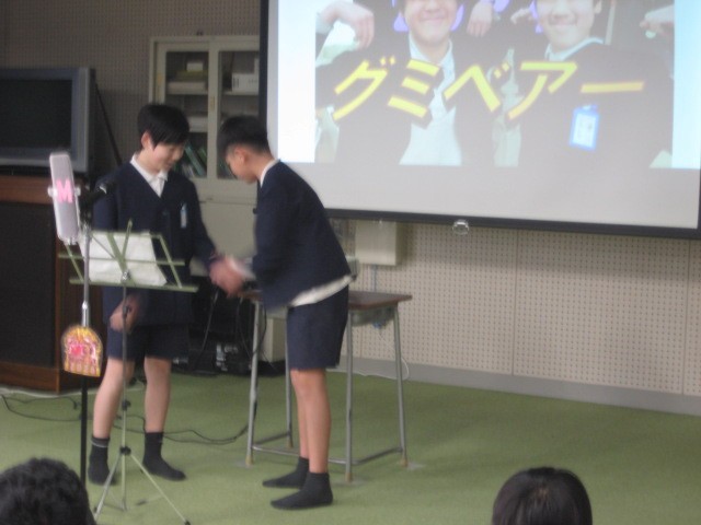 保護皆さんに見守られ、かなり緊張しているようにも感じられました。でも、マイクの前に立つ子ども達は本当に堂々として、がんばっていました。また、やり取りも本当に面白くてさすがに「なにわっ子」、お笑いのセンスを感じさせるものでした。見ている人全員に大うけしていました。背景には、子ども達のコンビ名が示された写真があり、テレビでおなじみの芸人さんの本番と同じセッティングに、ますますテンションをあげる様子もありました。先生たちが、子ども達の場の盛り上げのためセッティングを随分前から工夫していました。
