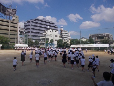 まず、地震が発生した際に、机の下に避難をして体を守る訓練をし、運動場に避難しました。その後、津波警報が発令されたとの想定で全員3階以上の教室に避難しました。