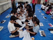 4年生が大阪市立クラフトパークの方に来ていただき、布のワークショップに取り組みました。長尺を輪ゴムでしぼっていき、その後藍染めを体験しました。いろいろな模様が出てきて、子どもたちも大喜びでした。