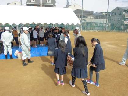 瓜破西中学校の校庭に瓜破北小・西小の6年生、瓜破西中学生全学年、地域防災リーダーのみなさんなどが集まりました。