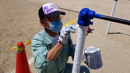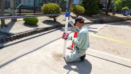 かんりさぎょういんさんが てつぼうを きれいに へんしんさせています。