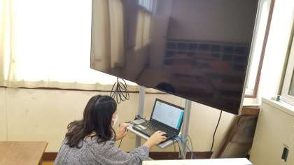 教室等の清掃・消毒作業に引き続き、デジタル教材の点検・確認をしています。