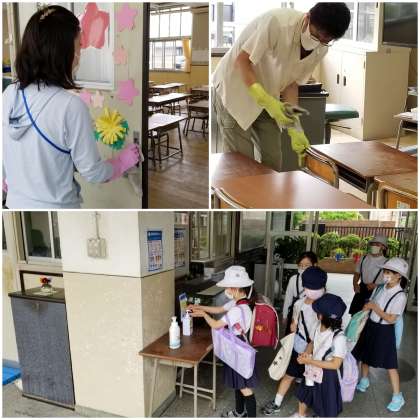 児童の登校前や入れ替わり時に、教職員が協力して消毒作業を行っています。