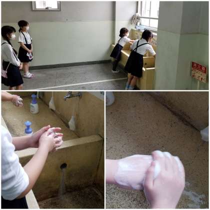 児童は登校してきたら、ていねいに手洗いをしています。