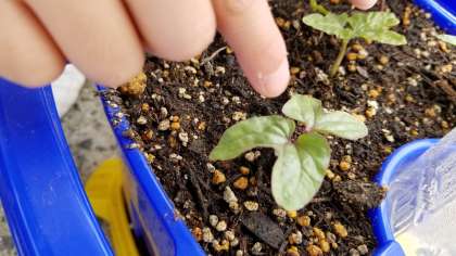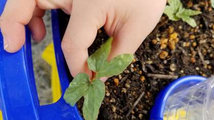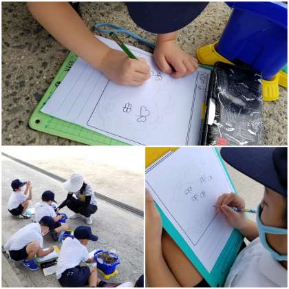 アサガオの双葉をさわって感触を確かめたり、形をよく見たりしたあとは絵をかきます。
