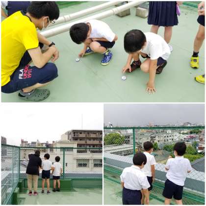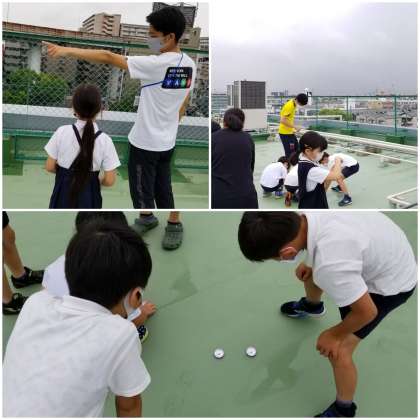 3年生が、校舎屋上で「方位磁針」を使って学習しています。