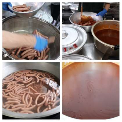 ウインナーのケチャップソースは、ケチャップ・デミグラスソース・ウスターソースを合わせて煮こみ、でんぷんでとろみをつけたソースをウインナーソーセージにかけています。