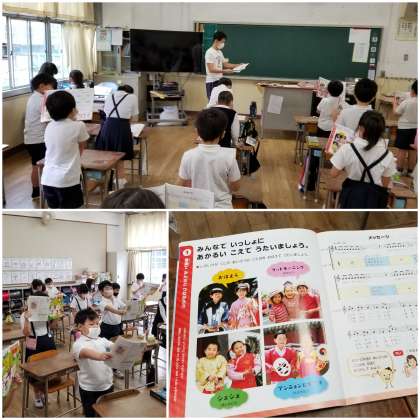 音楽を通して、外国の言葉やあいさつに親しんでいます。